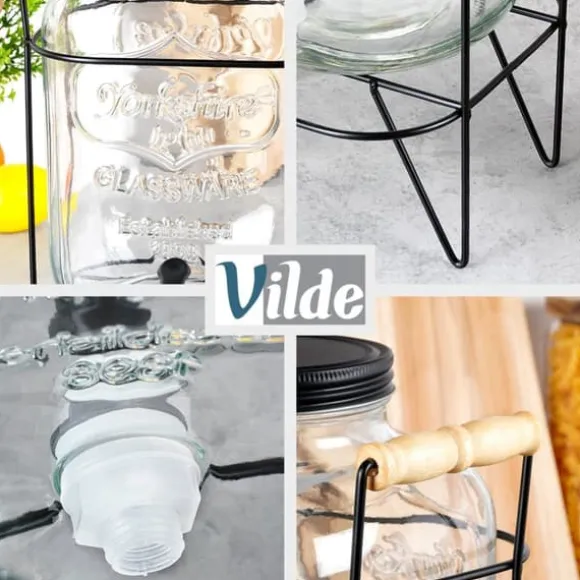 Detta set består av en burk med kran och stativ. Perfekt för att servera vatten, lemonad, juice, iste, smaksatt vatten och till och med punch. Kranen gör det enkelt att servera dina favoritdrycker på ett iögonfallande sätt. Burken med stativ kan användas både i trädgården och vid familjesammankomster. Det låsbara locket förhindrar att insekter kommer in i din dryck. Den är gjord av hälsosäkra och livsmedelsneutrala material. Ej lämplig för varma drycker. Observera! Förpackningen innehåller felaktig information om kapacitet; den faktiska kapaciteten är enligt beskrivningen ovan.Original Vilde produkt.Tillverkad i enlighet med europeiska standarder.
