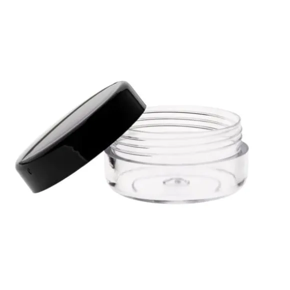 Burkbehållare färglös, 5 ml kapacitet, med svart lock, tillverkad av polystyren.