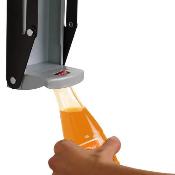 En smidig burkkrossare som med ett enkelt handdrag trycker ihop dina 33 cl aluminiumburkar till en bråkdel av sin storlek. Perfekt för att spara utrymme i sop- och återvinningskärlen. Burkkrossaren kan med fördel skruvas upp på väggen och fungerar då också som flasköppnare.