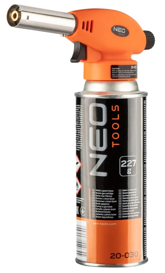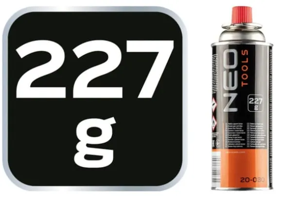 227 g butangaspatronen 20-030 från NEO TOOLS är en praktisk patron med krage som uppfyller EN417-standarden. Patronen är utformad för gasbrännare och campingkök, har en höjd på 200 mm och en diameter på 68 mm. Dess kapacitet är 227 g butangas. Den rekommenderas även för VVS-lödning, eldning och tändning.