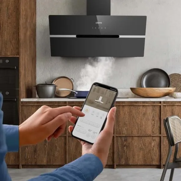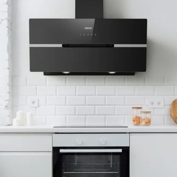 CIARRA CD9736FB är en lutande och elegant köksfläkt i svart glas med kraftfull DC-motor (85W). Den erbjuder fyra ventilationshastigheter, inklusive booster, och ett maximalt luftflöde på 650 m³/h. Du styr den enkelt via pekskärm eller appen Smart Life via Wi-Fi.