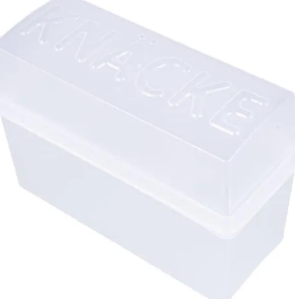I denna praktiska låda håller knäckebröd/kex längre och blir fräschare. Naturligtvis kan du även förvara andra lämpliga livsmedel i denna matförvaringslåda, som bröd, kex eller bakverk. Locket stänger lådan lufttätt och säkert. Det speciella blickfånget är ordet ”KNÄCKE” i 3D på toppen av locket. Denna förvaringslåda är livsmedelssäker och miljövänlig. Den går att rengöra i diskmaskin. Kapacitet 1,65 liter. Boxen finns i två färger: