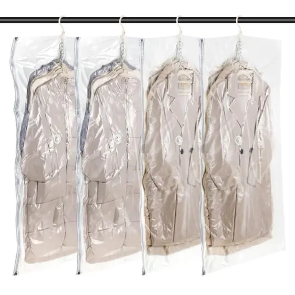 Denna uppsättning med 4 stora dammsugarpåsar för att hänga kläder är den perfekta lösningen för dig som vill spara plats i sin garderob, klädskåp eller resväska. Varje påse på 135 x 70 cm är utformad för att förvara kostymer, rockar, jackor och andra plagg som behöver hängas. Tack vare kraftfull kompressionsteknik kan påsarna minska volymen av förvarade föremål med upp till 80 %, vilket avsevärt ökar utrymmeseffektiviteten.