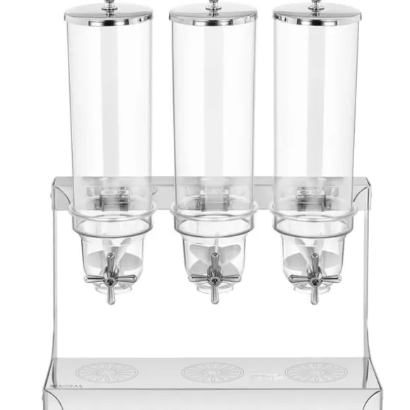 Producentkode: 10011387 Den praktiske Royal Catering korndispenser giver dig mulighed for at opbevare og bekvemt dispensere løse produkter: morgenmadsprodukter, små kiks og kager, slik, nødder, tørret frugt, kaffe. Den kan bruges overalt, hvor der serveres morgenbuffet – på hoteller, restauranter og bistroer. Den gennemsigtige cylinder lavet af plastik rummer 10,5 liter og isolerer produkterne perfekt mod ydre faktorer. Produktegenskaber: – Brugbarhed – til opbevaring og dispensering af løse produkter (op til 10,5 liters kapacitet), – Gennemsigtighed – den gennemsigtige cylinder giver dig mulighed for at se det aktuelle fyldningsniveau for dispenseren, – Økonomi – dispenseren måler den nøjagtige mængde flager , minimerer tab, – Holdbarhed – mad holder sig frisk i lang tid, – Design – stativ i rustfrit stål. Tekniske parametre: – Model – RCCS-3.5LSS3 – Katalognummer – 10011387 – Artikeltilstand – Ny – Basismateriale – Rustfrit stål – Beholdermateriale – Plast – Udløbsmateriale – Silikonegummi – Maksimal højde på det anbragte kar – 13 cm – Kapacitet – 3 x 3,5 l – Mål (LxBxH) – 50 x 26,00 x 65,00 cm – Vægt – 4,95 kg – Forsendelsesmål (LxBxH) – 55,00 x 29,00 x 37,50 cm – Fragtvægt – 5,75 kg Sættet indeholder: – Flake dispenser