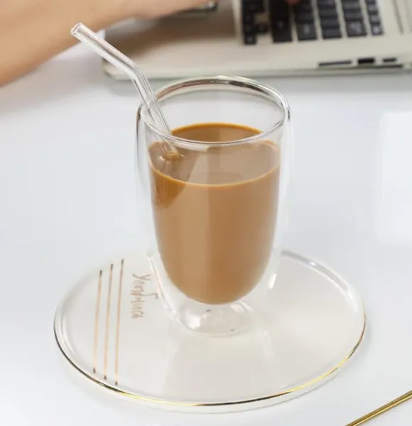 Denna eleganta glasmugg kombinerar dubbelskiktad isolering med högborosilikatglas för att bevara dryckers temperatur utan att överhetta händerna. Perfekt för kalla drycker, mjölk, kaffe eller te – ger varje drickögonblick en upphöjd ritual.