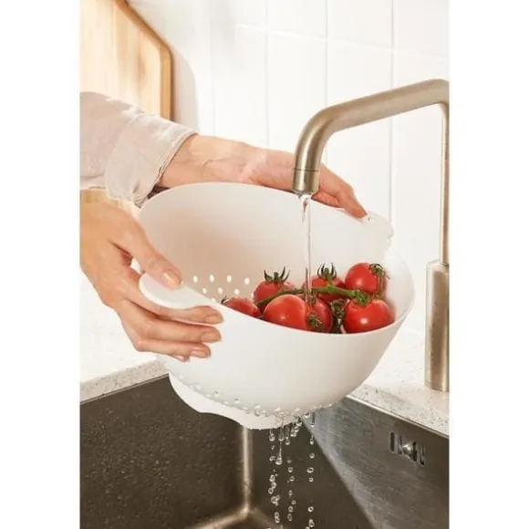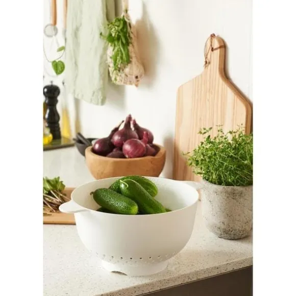 Utmärkt för att tvätta sallad, skölja av grönsaker och hälla av pastavatten. Står stadigt på egen hand, en förhöjd fot håller maten upphöjd från ytan. Svensk tillverkat.