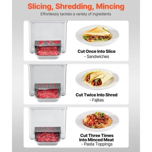 - Hanterar flera ingredienser: Vår köttskärningsmaskin kommer med en breddad och förstorad matningsport för ökad säkerhet och bekvämlighet. Den är perfekt för att skära benfritt kött som fläsk, lamm, nötkött, fisk samt mjuka grönsaker som kål och svamp.