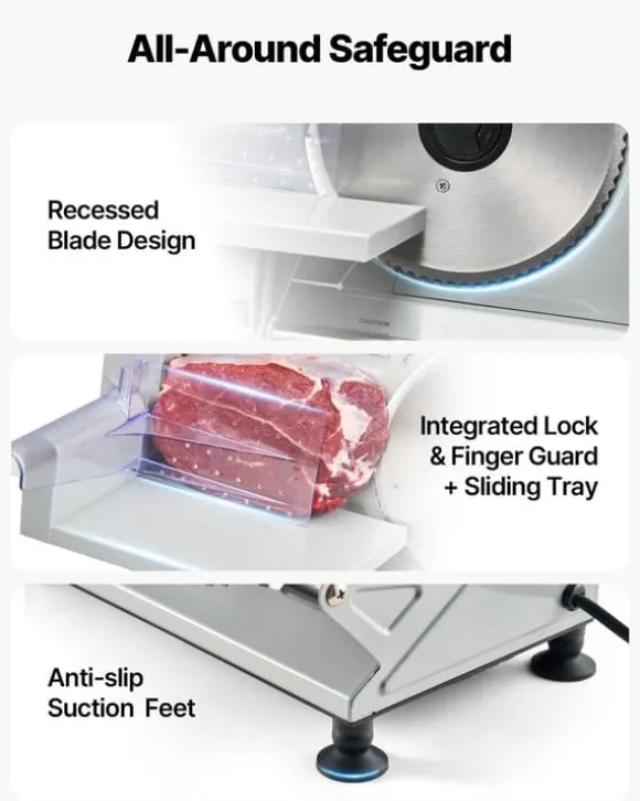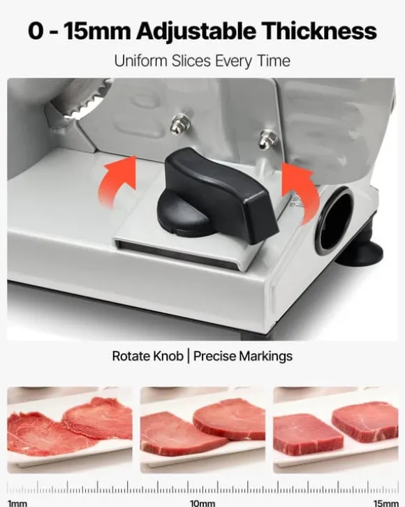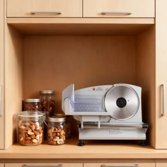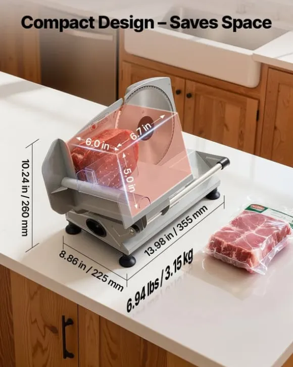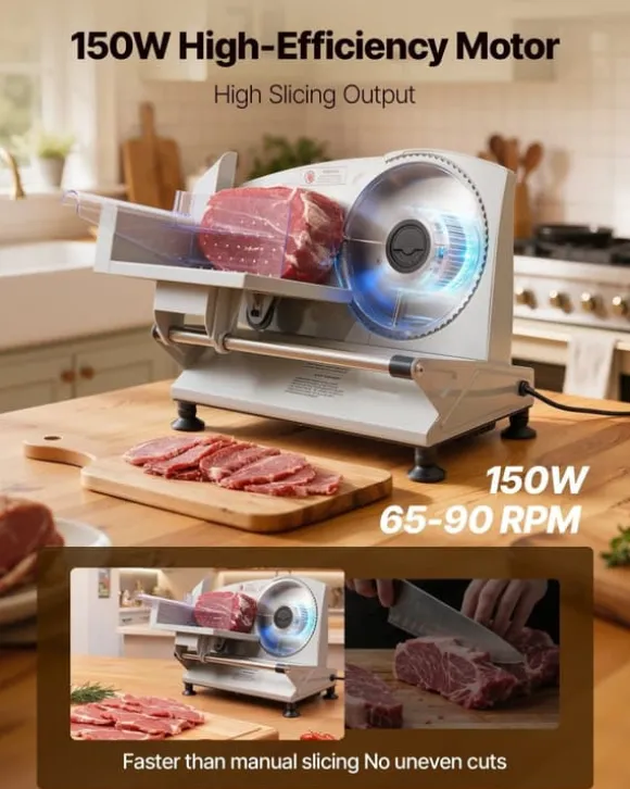 Kompakt kött- och delikatesskärare för exakta skivor varje gång Denna kraftfulla skivmaskin kombinerar två tandade rostfria stålblad med en 150 W motor för snabb, jämn och smidig skärning. Med precis tjockleksjustering och smart säkerhetsdesign får du perfekta skivor av kött, chark, bröd, ost, grönsaker och frukt – och enkel rengöring efteråt.