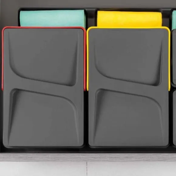 Recycle Emuca lådkärl, integrerade i köksmöblerna, gör det enklare att sortera avfall på ett diskret och organiserat sätt. De finns i två höjder med en användbar kapacitet på 7 liter till 15 liter. Dessa sopkärl har ett färgat handtag för att bättre identifiera avfall, samt för att underlätta utvinningen och därmed tömningen och rengöringen. Spel