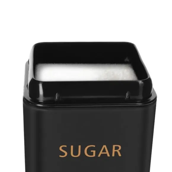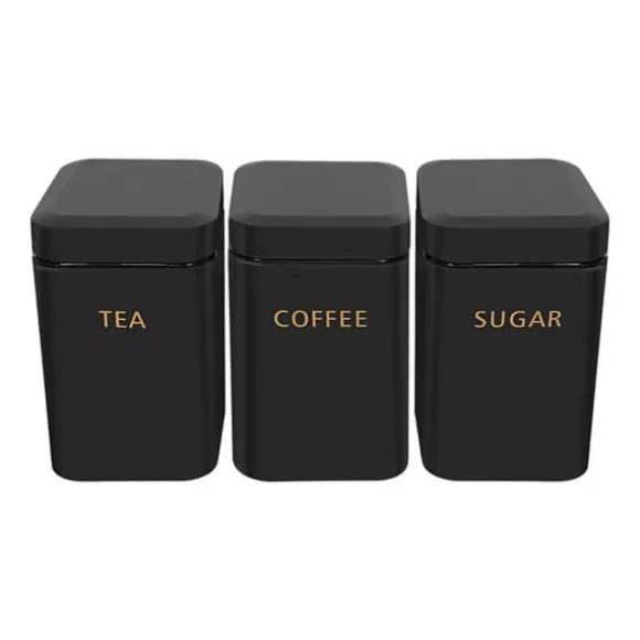 Ge upp stil och organisation till ditt kök med detta set av 3 svarta metallaskar, designade för att bevara kaffe, te och socker i bästa möjliga förhållanden. Deras eleganta finish med gyllene inskriptioner förenar estetik och praktisk funktion. Det robusta stålet skyddar dina livsmedel och bevarar deras färskhet, samtidigt som det ger din bänkskiva ett modernt och välskött utseende.