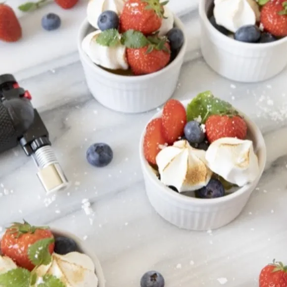 I detta set ingår dyra vita suffléskålar och en brännare som är smidig och behändig.