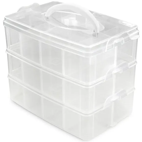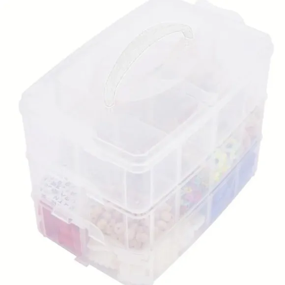 Förvaringslådan består av 3 lager som du enkelt klickar ihop. Förutom hobbytillbehör som smyckestillverkning, diamantmålning, mosaik, korttillverkning och scrapbooking, är sorteringssystemet också idealiskt för att förvara smink, skruvar och mindre byggklossar.