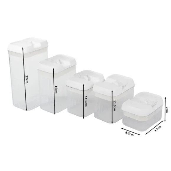 Ett set med 5 praktiska köksburkar med lufttäta lock är den perfekta lösningen för att förvara pasta, ris, gryn, frukostflingor, kaffe, te, kakor och godis. Tack vare de lufttäta locken förblir produkterna färska och behåller sin arom längre, och deras innehåll är väl skyddat mot fukt och insekter.