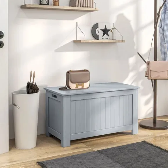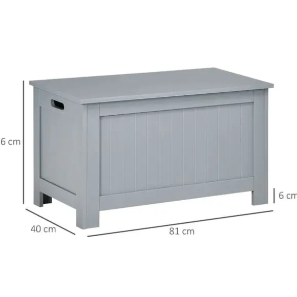 Mångsidig förvaringslåda i ljusgråttDenna rymliga förvaringskista i ljusgrå färg hjälper dig att organisera kläder, sänglinnen, leksaker och mycket mer. Tillverkad i tålig MDF och utrustad med ett säkerhets gångjärn som håller locket öppet – funktion och stil i ett modernt utförande.