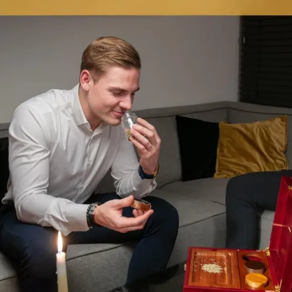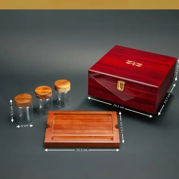 Setet innehåller en avtagbar bricka och tre lufttäta glasbehållare med lock i akaciaträ, som perfekt matchar lådans insida. Detta gör att du kan förvara alla dina prylar, accessoarer och avkopplingsprodukter på ett ställe, prydligt och snyggt.