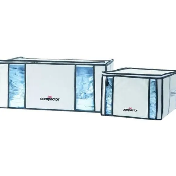 Set med 2 vakuumförvaringspåsar Compactor: 1 Huvudkudd Life XXL 210L (50 x 65 x H27 cm) och 1 Huvudkudd Compactino M 125L (42 x 40 x H25 cm). Perfekt för att komprimera täcken, kuddar och kläder. Påsarna är gjorda av polypropen och nylon, med universell ventil. Garanti 1 år.