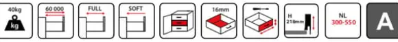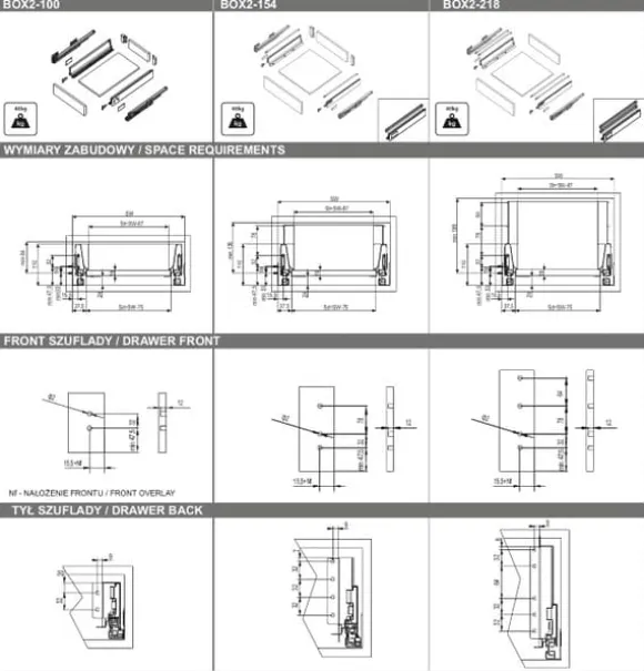 BOX2 är en låda tillverkad av högkvalitativa material, tack vare vilken den arbetar tyst och smidigt. Dess höga lastkapacitet (upp till 40 kg) möjliggör stressfri förvaring av alla typer av föremål. Lådan är mycket felfri, med 60 000 öppnings- och stängningscykler, vilket innebär att den kan användas utan fel i upp till 11 år.Lådan har full utdragbarhet och mjukstängningsfunktion. Den finns i tre olika höjder och flera längder.