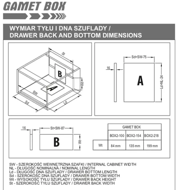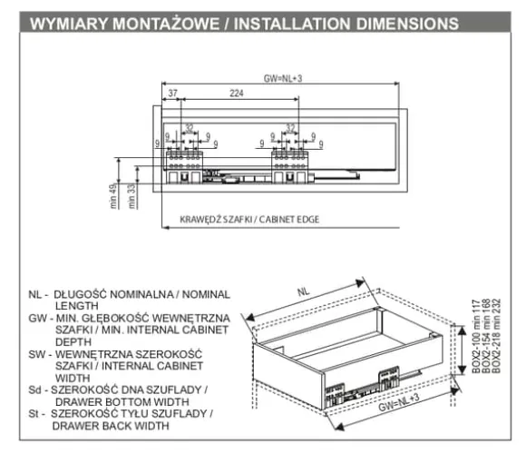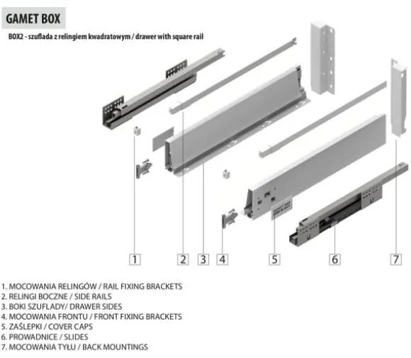 BOX2 är en låda tillverkad av högkvalitativa material, tack vare vilken den arbetar tyst och smidigt. Dess höga lastkapacitet (upp till 40 kg) möjliggör stressfri förvaring av alla typer av föremål. Lådan är mycket felfri, med 60 000 öppnings- och stängningscykler, vilket innebär att den kan användas utan fel i upp till 11 år.Lådan har full utdragbarhet och mjukstängningsfunktion. Den finns i tre olika höjder och flera längder.