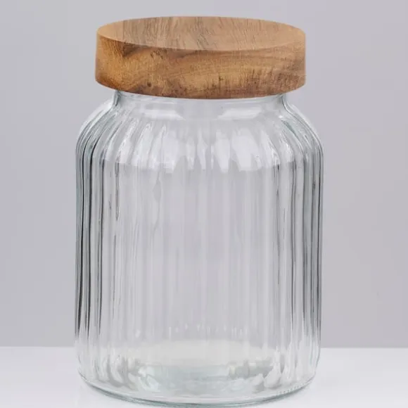 Denna glasburken med trälock är en stilfull och praktisk lösning för förvaring av torrvaror i köket. Den räfflade glasytan ger ett modernt och dekorativt utseende, samtidigt som det slitstarka materialet säkerställer långvarig användning. Med en volym på cirka 1000 ml rymmer burken generösa mängder av dina favoritvaror, vare sig det handlar om kaffe, socker, pasta eller nötter.