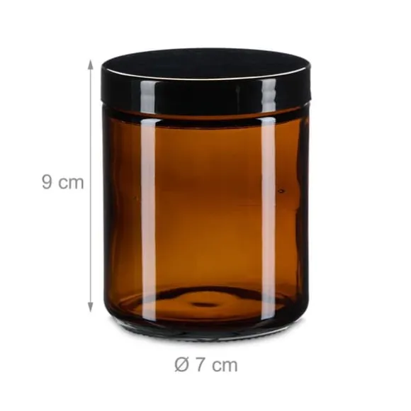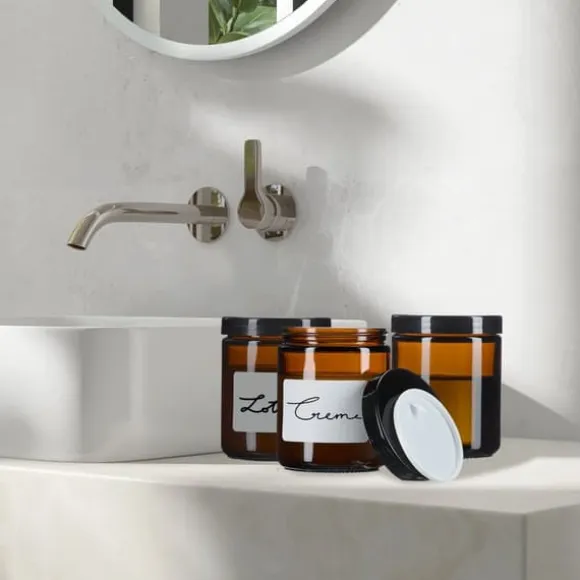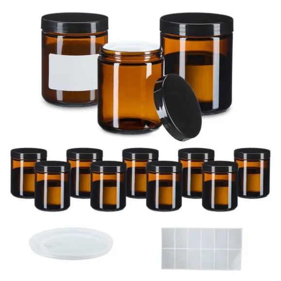 Detta set med burkar i bärnstensfärgat glas är idealiskt för förvaring av hemmagjorda krämer, salvor, eteriska oljor och andra kosmetiska produkter samtidigt som ingredienserna skyddas från UV-strålning. Burkarna har ett tätt skruvlock och levereras med etiketter och skyddslock för extra skydd och enkel identifiering.