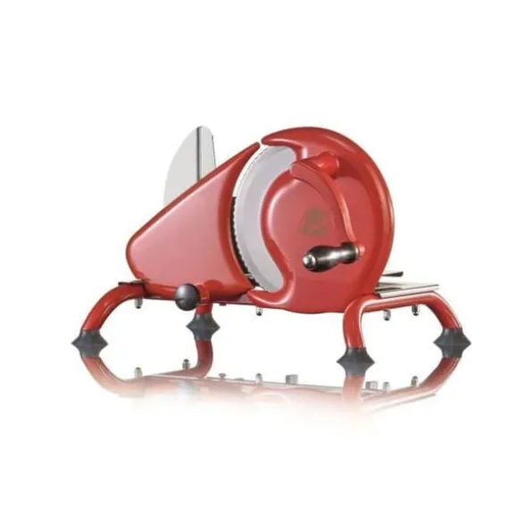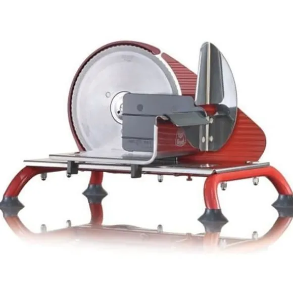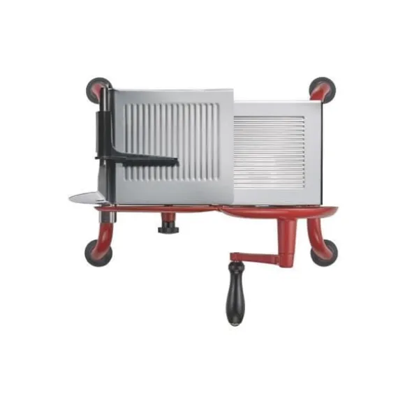Manuella skivmaskinen GRAEF HE93, i röd, är utrustad med ett tandat blad av rostfritt stål på 190 mm. Den möjliggör justerbar skivtjocklek från 0 till 15 mm. Dess avtagbara vagn och fingervakt säkerställer en säker användning. Dimensioner: 37,5×36,5×24,5 cm. 2 års garanti.