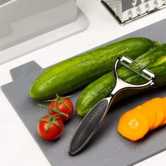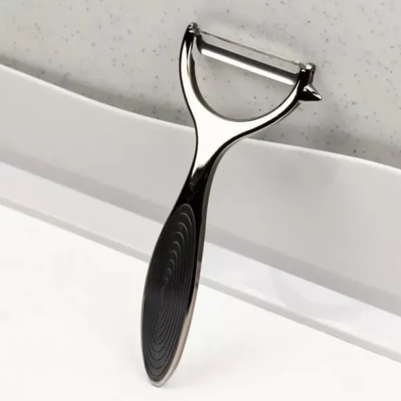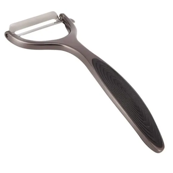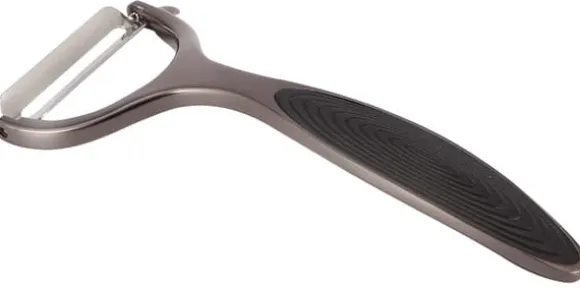 Stålskalare för grönsaker och frukter i grafitfärg. Halkfritt, ergonomiskt handtag med silikoninlägg.