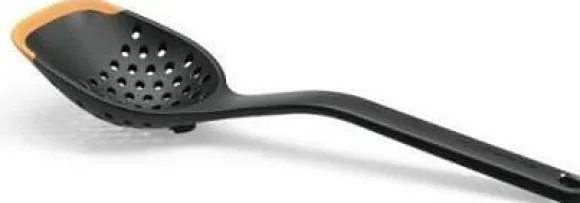 Tekniska data: Bredd: 92 mm Längd: 45 mm Höjd: 372 mm Vikt: 110 g Silikonkanten repar inte beläggningen på köksredskapet Hålen gör det lättare att sila grönsaker eller pasta Ett speciellt stöd förhindrar att skeden vidrör köksbänken direkt (vilket hjälper till att hålla köket snyggt) Skedens form gör det lättare att skrapa bort mat från kanten av fatet Hålslev med funktionell form ** Illustrativa bilder