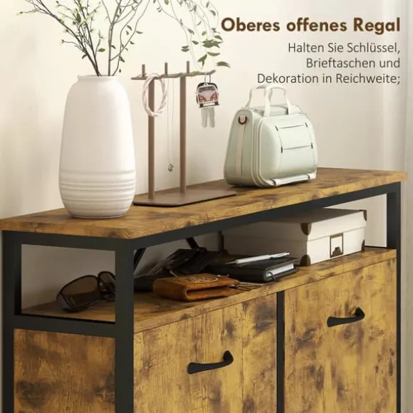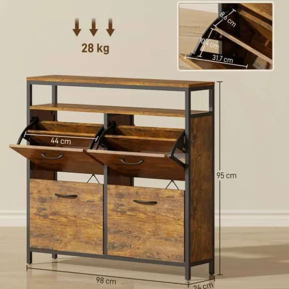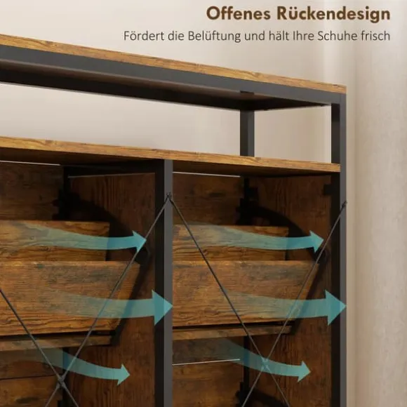 Stör du dig på skor som ligger och skräpar i entrén? HOMCOM skoskåp med lådor ger en lösning, med gott om plats för upp till 20 par skor. Dess industriella look av rustikt trä, med en matt svart stålram, ger ditt hem en speciell vintage-känsla. Tack vare den smala designen är skoskåpet idealiskt för trånga utrymmen och ger stilfull ordning i ditt hem.