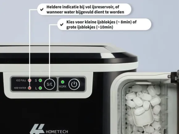 Gör enkelt upp till 15 kg isbitar på 24 timmar med HomeTech HT023, perfekt för fester och hotell, med en kapacitet på 2,2 liter och möjlighet att göra stora eller små isbitar.