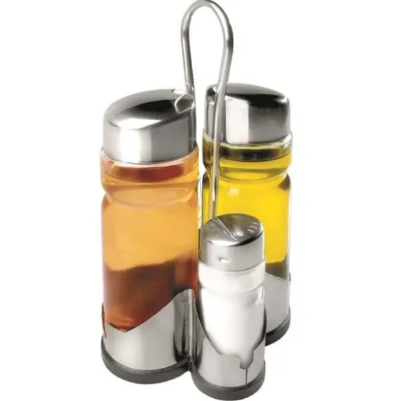 ROSTFRITT STÅLSET 4 ST OLJA-VÄTTIKA-SALT-PEPPER – Set salt, peppar, olja och vinäger Glas och rostfritt stål av överlägsen kvalitet Rostfritt stålstöd Salt- och pepparkapacitet: 0,0375 L Kapacitet…Se presentationen