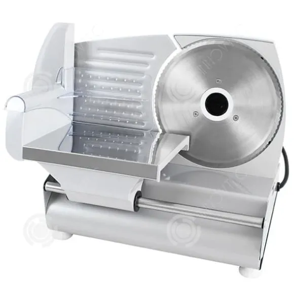 4. Tjockleksjustering: Den har en skalvred för att finjustera skivtjockleken mellan 0-15 mm. Brickan mäter 19 x 16,5 cm. Denna maskin är idealisk för att skära olika råvaror såsom kött, kallskuret, skinka, ost, bröd, korv, etc.