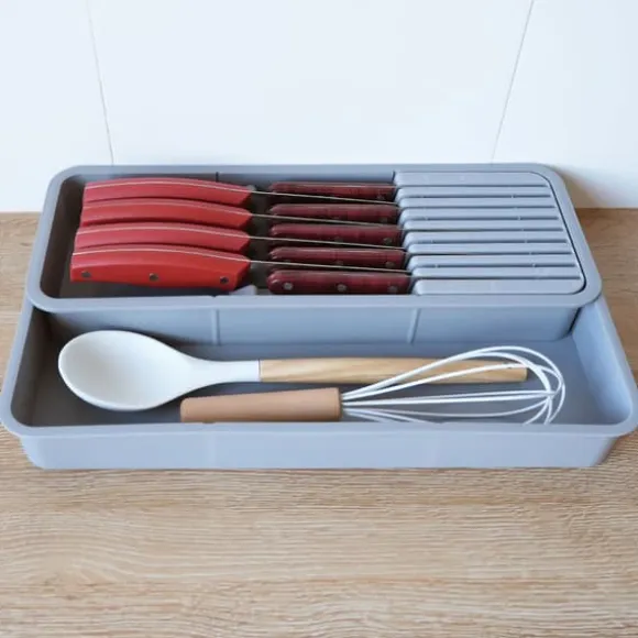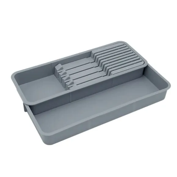 Denna praktiska knivlåda är perfekt för att hålla reda på dina köksknivar och andra redskap. Den justerbara bredden låter dig anpassa lådan efter dina förvaringsbehov, och den robusta PP-konstruktionen garanterar långvarig användning. Med en vikt på endast 565g är den enkel att hantera och passar smidigt in i de flesta kökslådor. Och den rena, gråa designen ger en modern touch till köksmiljön.