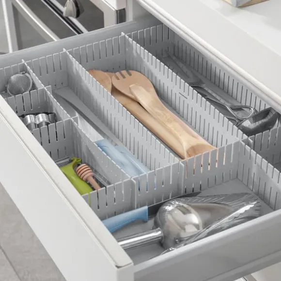 Denna justerbara lådarrangör anpassar sig perfekt till olika dimensioner och utrymmen, efter dina behov. Den innehåller instruktioner för användning för att placera den korrekt i olika positioner. De 16 medföljande enheterna kan skäras och sammanfogas vinkelrätt för att helt passa det önskade utrymmet. De kan också placeras vertikalt.