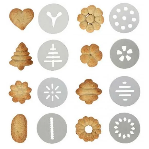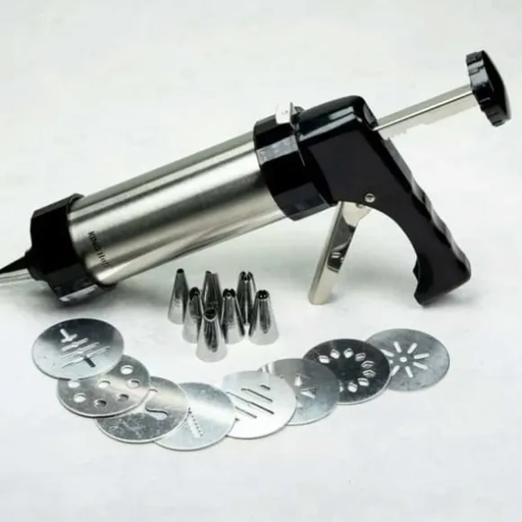 Maskin för att göra kakor och dekorera bakverk – Stålkolvstång – ABS-spak – Justerbar kaktjocklek – 8 kakskivor – 8 dekorationsmunstycken – Lätt att rengöra – Trycker hela degen genom cylindern, utan att täppa till – Lätt att hålla och kontrollera. squeezer