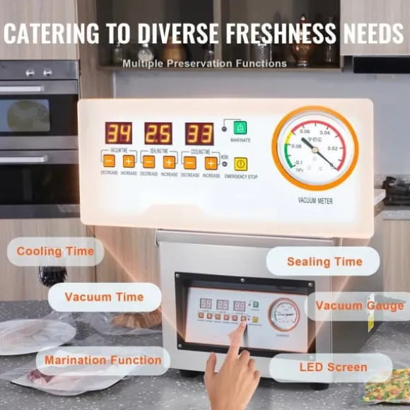 Denna vakuumkammarmaskin erbjuder inte bara en förstklassig vakuumeffekt utan har också flera praktiska funktioner som gör livsmedelsbevarande enklare. Den justerbara kylningstiden säkerställer snabb nedkylning av förseglade livsmedel för maximal fräschör. Ytterligare praktiska funktioner som nödstopp, start och marinering tillgodoser olika användarbehov.