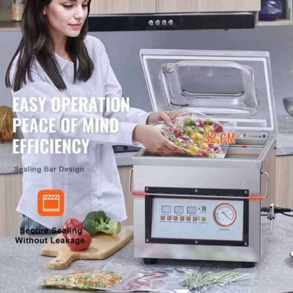 Försegla påsar upp till 12,6 tum/320 mm med lätthet! Vår kommersiella vakuumförpackare erbjuder ett större förseglingsområde, vilket gör att du enkelt kan hantera påsar av olika storlekar. Tack vare den avancerade tryckstångdesignen blir användningen mer bekväm och säkerställer en pålitlig försegling varje gång. Oavsett om det är små eller stora påsar, förseglar den perfekt och bevarar fräschören och smaken av dina ingredienser.