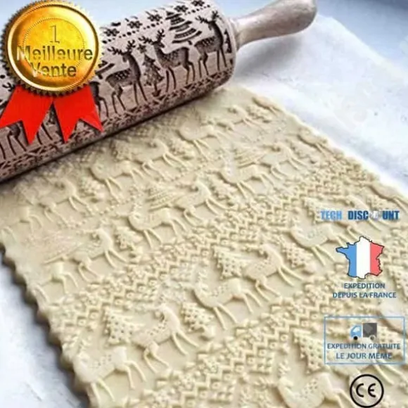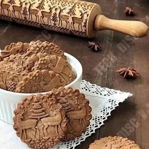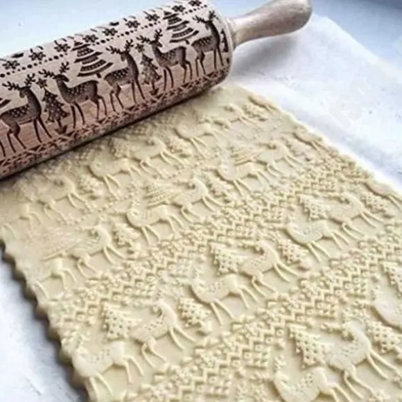 Kavel i trä med mönster av julträd och renar. Perfekt för att dekorera dina kakor och tårtor. dimensioner: 35 cm x 5 cm. Ett oumbärligt köksredskap för högtider.