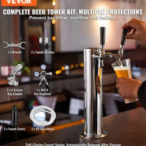 Njut av färsk, perfekt upphälld öl hemma eller på fester med detta kegerator-tornkit med dubbla kranar. Designat för hållbarhet och enkel användning, har det ett öltorn i rostfritt stål, dubbelmätarregulator och självstängande kranar för att förhindra spill och slöseri. Perfekt för att servera olika kolsyrade drycker, detta kit säkerställer att varje dryck är fräsch och kall.