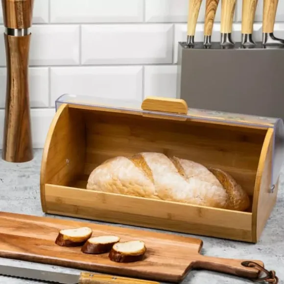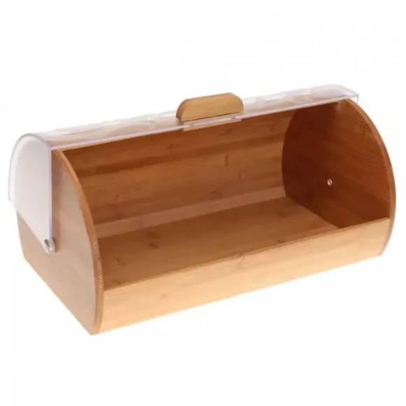 Klassisk brödlåda i bambu utrustad med ett transparent lock i akryl med en dekorativ prydnad – Materialen som används är ekologiska och hygieniska – Lätt att använda, ingen extra yta krävs för att öppna locket – Locket öppnas och stängs försiktigt – Lätt och solid konstruktion – Avsedd för förvaring av alla typer av föremål typer av bröd och kakor – Storlek: 36x21x17 cm