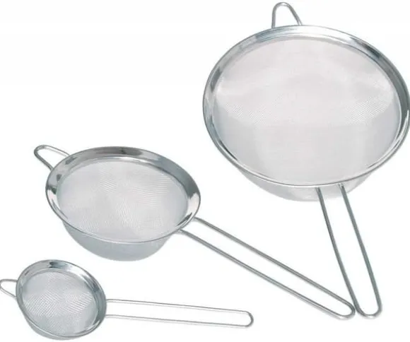 En uppsättning kökssilar av rostfritt stål. Användbar för mjöl, strösocker eller silningsbuljonger. Setet innehåller 3 silar, dimensioner: 10, 14, 18 cm