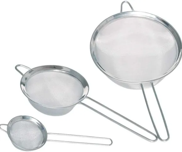 En uppsättning kökssilar av rostfritt stål. Användbar för mjöl, strösocker eller silande buljonger. Setet innehåller 3 siktar med måtten: 10, 14, 18cm