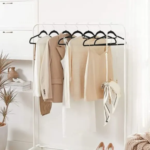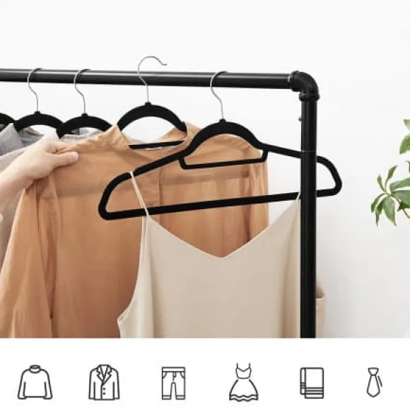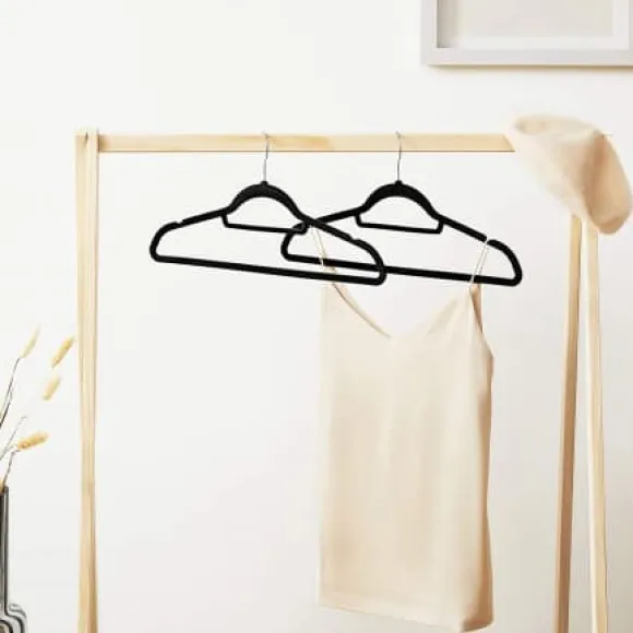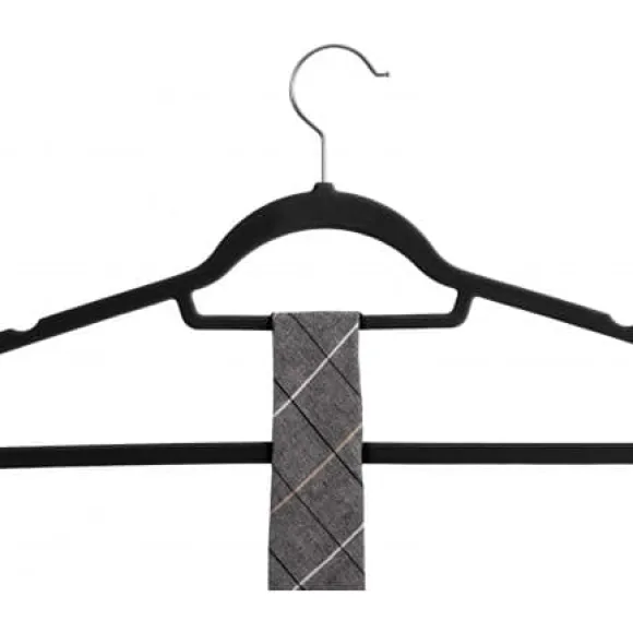– VAD DU FÅR: Set med 50 sammetshängare, axelskåror för att fästa remmar, mittstång för halsdukar eller slipsar, bottenstång som håller byxorna stadigt.