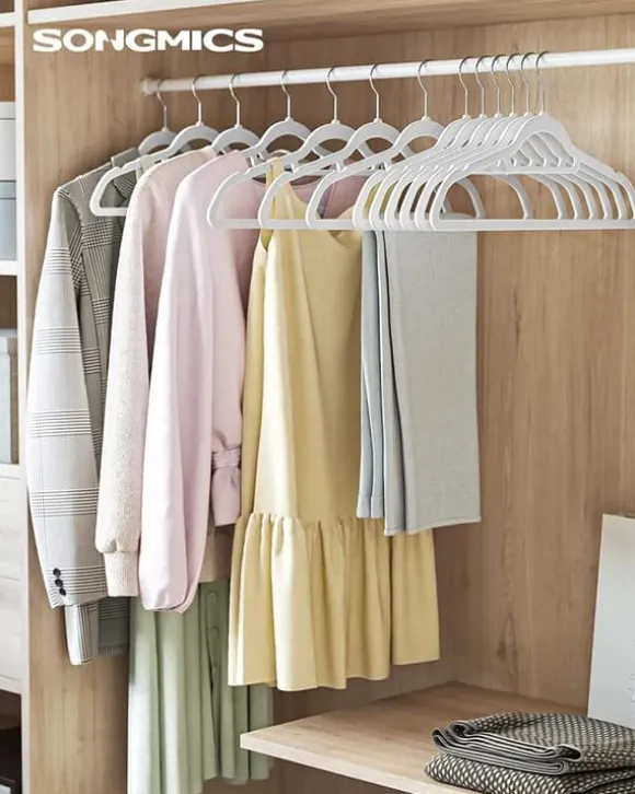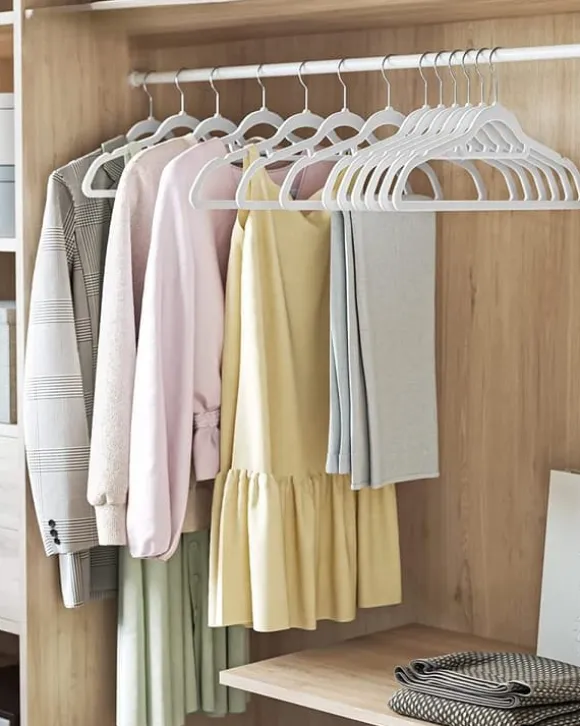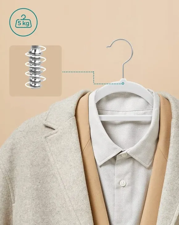 - Sparar utrymme: Dessa smala galgar är starka nog för tunga kläder och håller kläderna i perfekt ordning samtidigt som de maximerar ditt värdefulla garderobsutrymme.