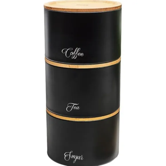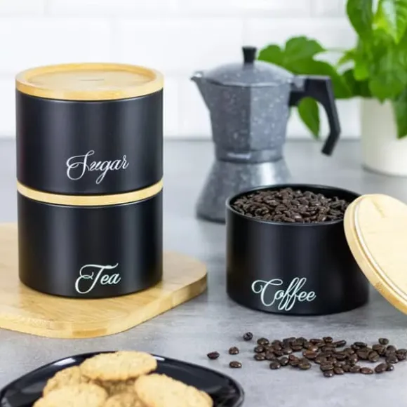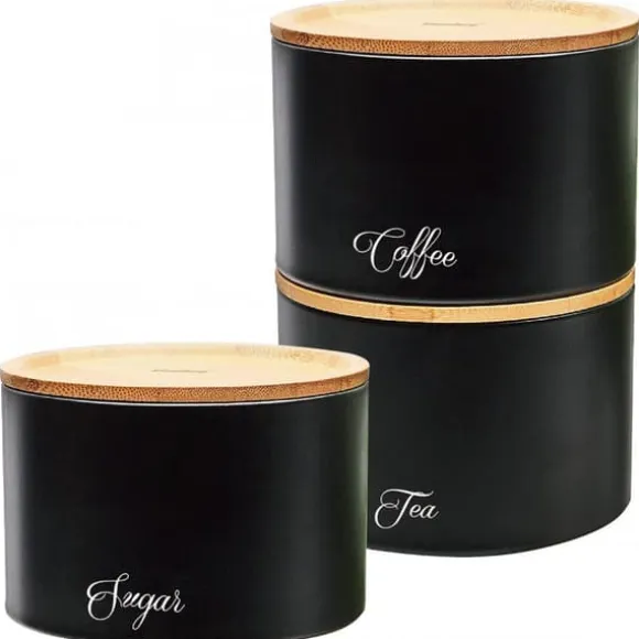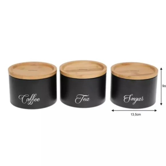 Set med 3 behållare med bambulock för förvaring av bulkprodukter. En produkt från KLAUSBERG Stomme av svartlackerat rostfritt stål. Behållarna är inskrivna med orden Socker, Kaffe, Te. Lock försedda med silikontätningar för att säkerställa lufttäthet hos lagrade produkter. Färg: svart/ljus trä. Behållarens mått: 13,5 x 13,5 x 9,3 cm Lätt att rengöra och förvara Endast handtvätt, torka noggrant direkt efter tvätt