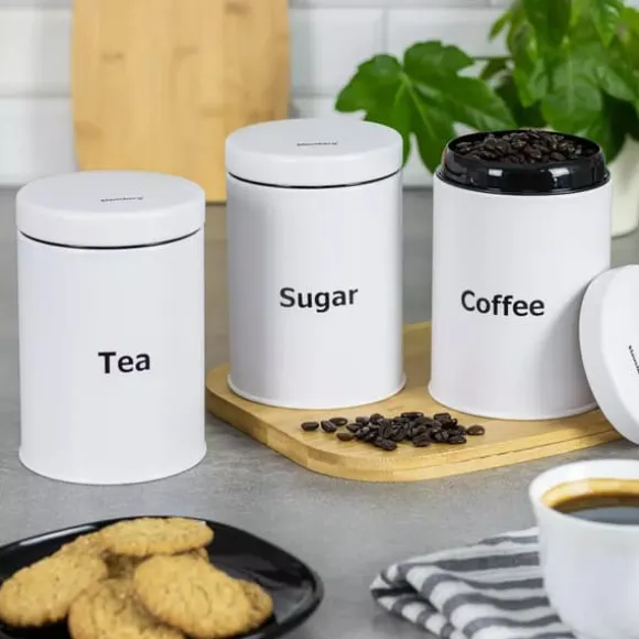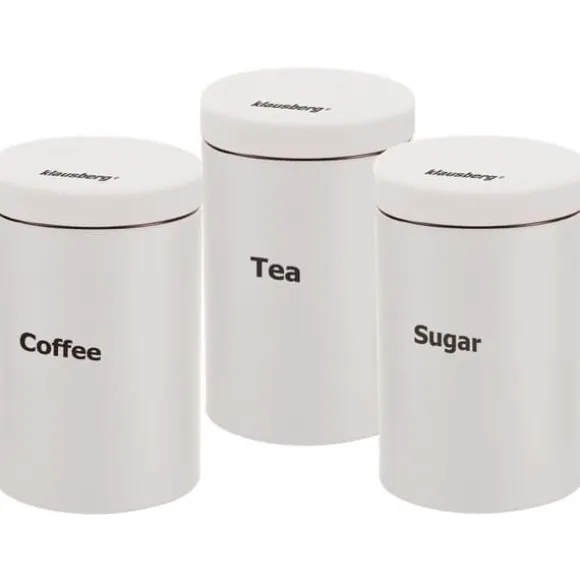 Set med 3 metallbehållare för förvaring av bulkprodukter. En produkt från KLAUSBERG Stomme av vitlackerat rostfritt stål. Behållarna är inskrivna med orden Socker, Kaffe, Te. Färg: vit Mått på behållare: Ø11 x 17 cm Lätt att rengöra och förvara Endast handtvätt, torka noggrant direkt efter tvätt