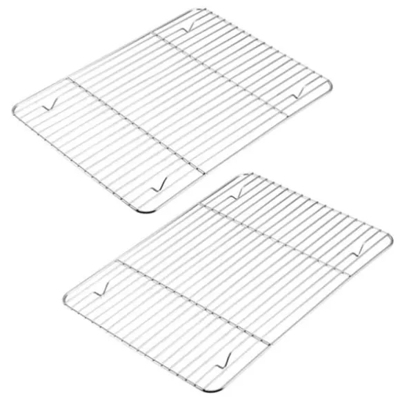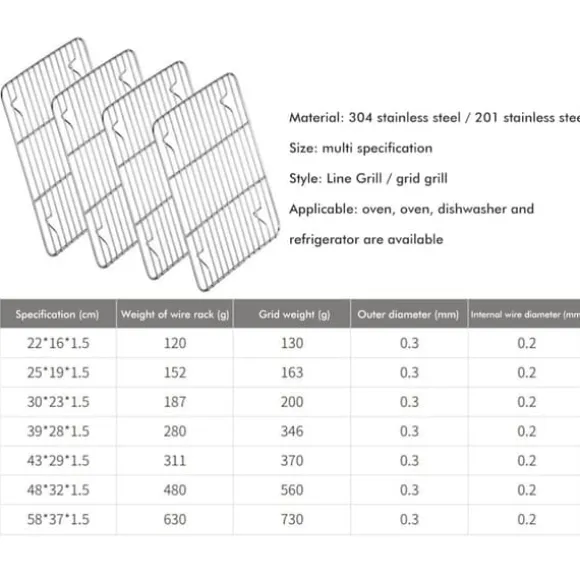 1、 Ingen galvanisering, ingen beläggning, så det finns ingen anledning att oroa sig för kemikalier, skalar av skräp i maten. Hela gallret är tillverkat av rostfritt stål av livsmedelskvalitet 304. Professionella bakställ är förtroendebeständiga och kräver inte täta byten 2、 Robust struktur, solid fyra fots svetsning, god styrka och hållbarhet, motstånd mot vridning och skakning. Höjden på 1,5 cm lyfter maten och låter luften cirkulera runt pannan för perfekt tillagning och kylning utan att vända maten.