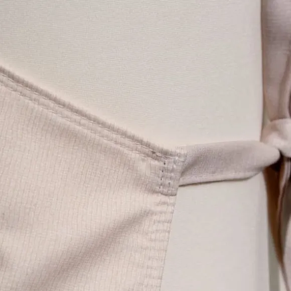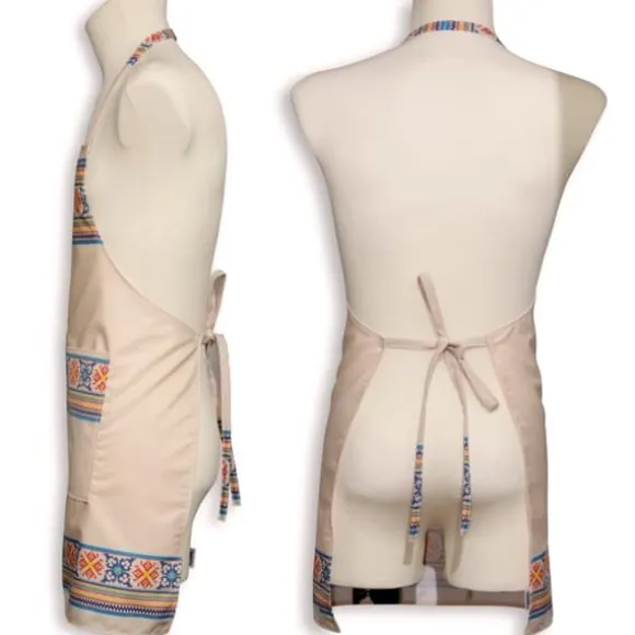 Klipp: universal / unisex – vi presenterar bilder av samma förkläde på en kvinnlig och en manekäng. Dessutom framhäver bältesbanden midjan.