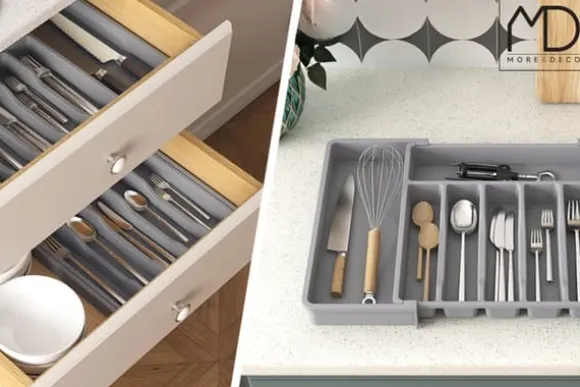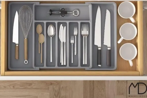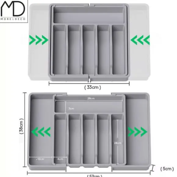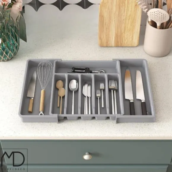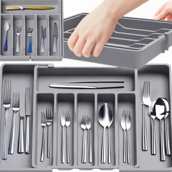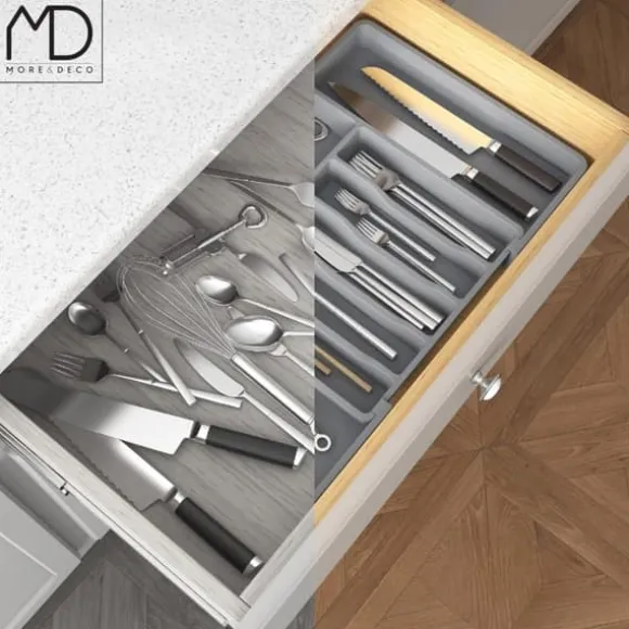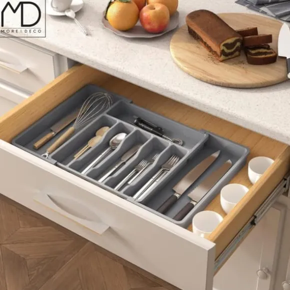⚫️ Upptäck grå, justerbar besticklådeorganisatör som kommer att förändra hur du förvarar inte bara bestick, utan även många andra föremål.