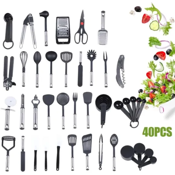 Allsidigt 40-delars köksredskapsset – svartDetta kompletta set ger dig allt för att steka, röra, servera och baka. Med hållbara huvuden i nylon och rostfritt stål får du säker hantering, lång livslängd och enkel rengöring. Den svarta finishen passar stilrent i alla kök.