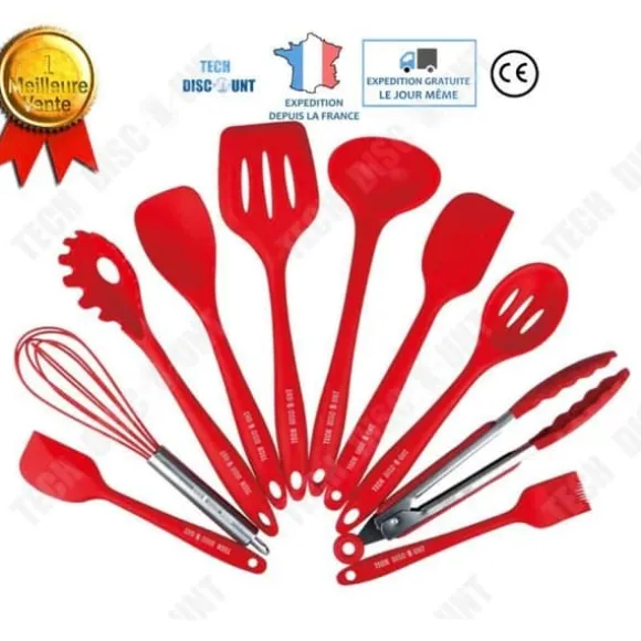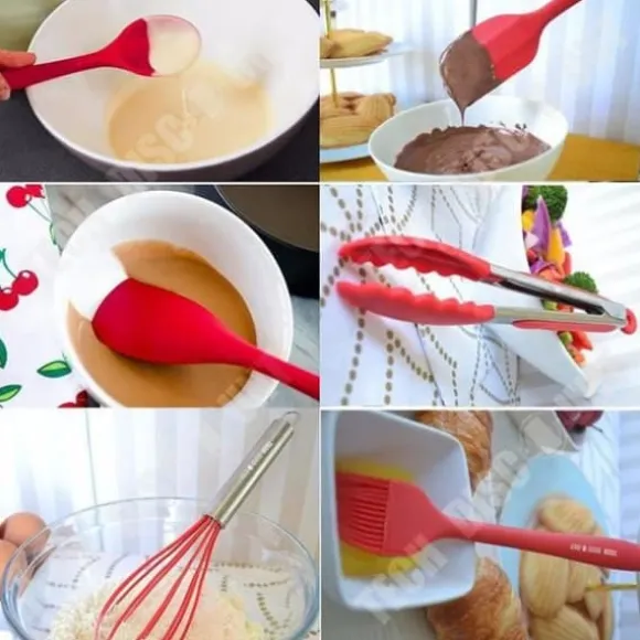 Detta set med 10 köksredskap i röd silikon är perfekt för bakning och grillning. Tillverkade av livsmedelsklassad silikon och rostfritt stål, hjälper dessa icke-toxiska verktyg dig att säkert förbereda dina rätter och desserter.
